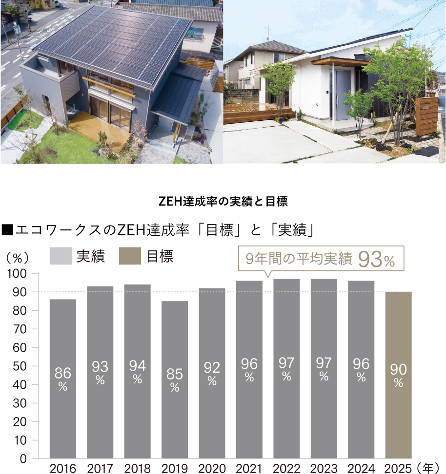 2016年から2024年までの9年間、エコワークスにおけるZEH平均達成率は93%で、年間50戸以上を建築するビルダーとしての日本トップレベル実績※を誇ります。国の2020年度の目標である新築住宅の平均でZEH化をいち早く達成しています。